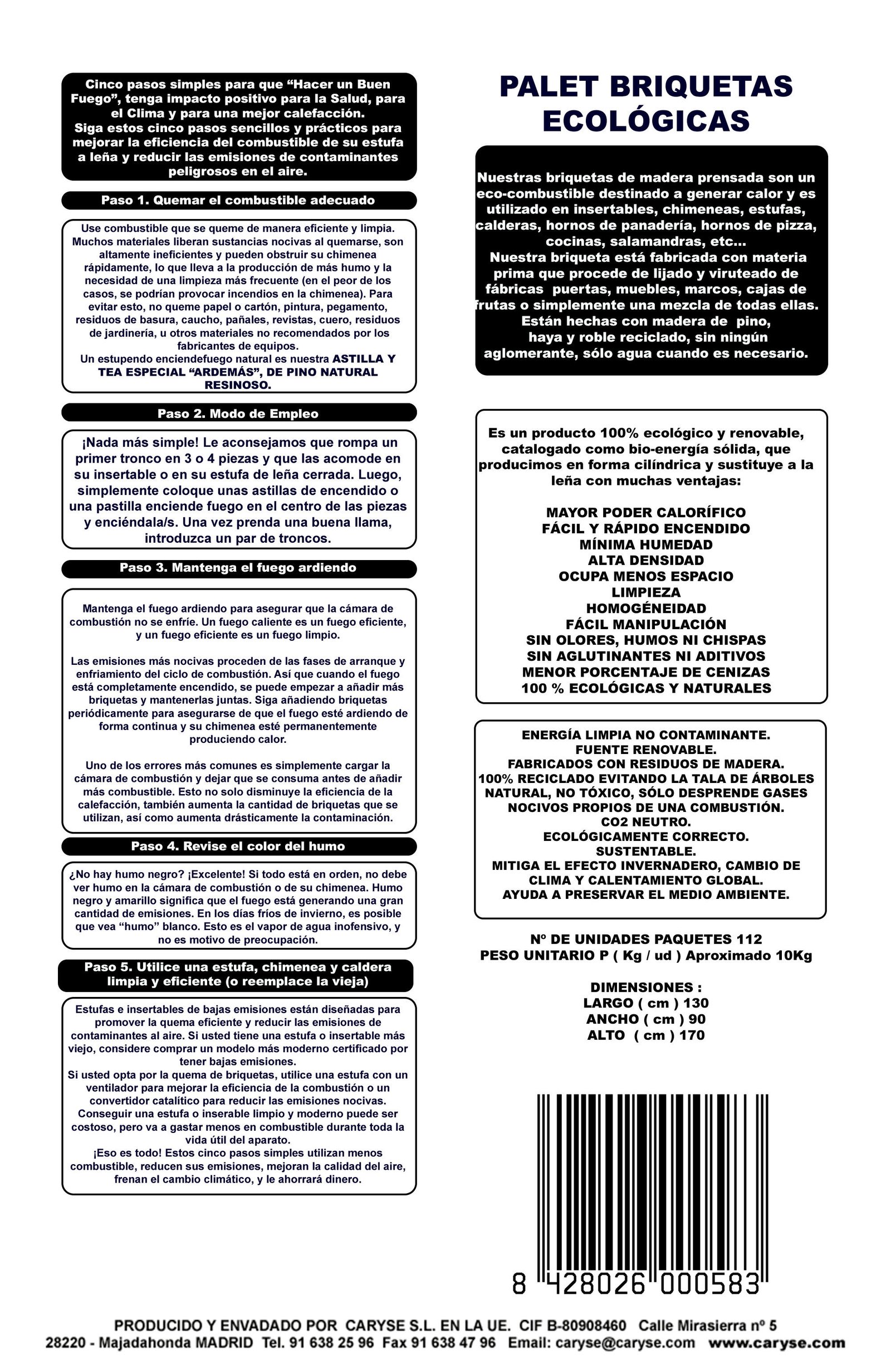 Palet completo de 112 packs de briquetas de madera en pack de 10 Kg que contempla un total de 8 troncos. Las briquetas de madera prensada son un ecocombustible destinado a generar calor. Es un producto 100 % ecológico y renovable. Mayor poder calorífico, fácil y con rápido encendido, mínima humedad, alta densidad y ocupa menos espacio. Certificación PEFC (bosque sostenible). Grantía 3 años. Entrega a pie de vehículo.